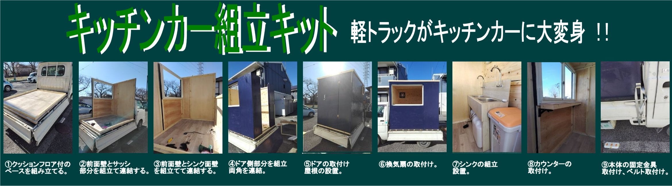 軽トラの荷台に乗せてキッチンカーとして使用できるキットを販売いたします。 # 商品説明文 名称 キッチンカー組立キット 内容量 1セット 組み立て時間 約3時間 対象年齢 10歳以上 ■あなた専用のキッチンカーを作ろう! このキッチンカー組立キットは、オリジナルのキッチンカーを手軽に作成できるアイテムです。自分自身のアイディアを形にし、楽しい時間をお過ごしください!お料理を提供する夢の空間を手に入れることができます。 ■簡単組立 分かりやすいパーツと説明書付きなので、DIY初心者の方でも安心して組み立てられます。お子様との共同作業にもぴったり!完成後は、キッチンカーを使っておままごとやデコレーションを楽しめます。 ■夢を広げるアイディア このキッチンカーは、料理や販売のシミュレーションの場としても活用できます。友達を呼んで、自分だけのフードフェスティバルを開催してみてはいかがでしょうか。子どもたちの創造力を引き出します。 ■大切に育てよう 使用後は、しっかりとメンテナンスをし、次回に備えておきましょう。このキッチンカーは、あなたの想い出をたくさん詰め込むことができるアイテムです。お子様の成長を見守りながら、一緒に楽しさを共有してください! このキッチンカー組立キットで、夢のキッチンカーライフをスタートしましょう! # 商品説明文 名称 キッチンカー組立キット 内容量 1セット 組み立て時間 約3時間 対象年齢 10歳以上 ■あなた専用のキッチンカーを作ろう! このキッチンカー組立キットは、オリジナルのキッチンカーを手軽に作成できるアイテムです。自分自身のアイディアを形にし、楽しい時間をお過ごしください!お料理を提供する夢の空間を手に入れることができます。 ■簡単組立 分かりやすいパーツと説明書付きなので、DIY初心者の方でも安心して組み立てられます。お子様との共同作業にもぴったり!完成後は、キッチンカーを使っておままごとやデコレーションを楽しめます。 ■夢を広げるアイディア このキッチンカーは、料理や販売のシミュレーションの場としても活用できます。友達を呼んで、自分だけのフードフェスティバルを開催してみてはいかがでしょうか。子どもたちの創造力を引き出します。 ■大切に育てよう 使用後は、しっかりとメンテナンスをし、次回に備えておきましょう。このキッチンカーは、あなたの想い出をたくさん詰め込むことができるアイテムです。お子様の成長を見守りながら、一緒に楽しさを共有してください! このキッチンカー組立キットで、夢のキッチンカーライフをスタートしましょう!