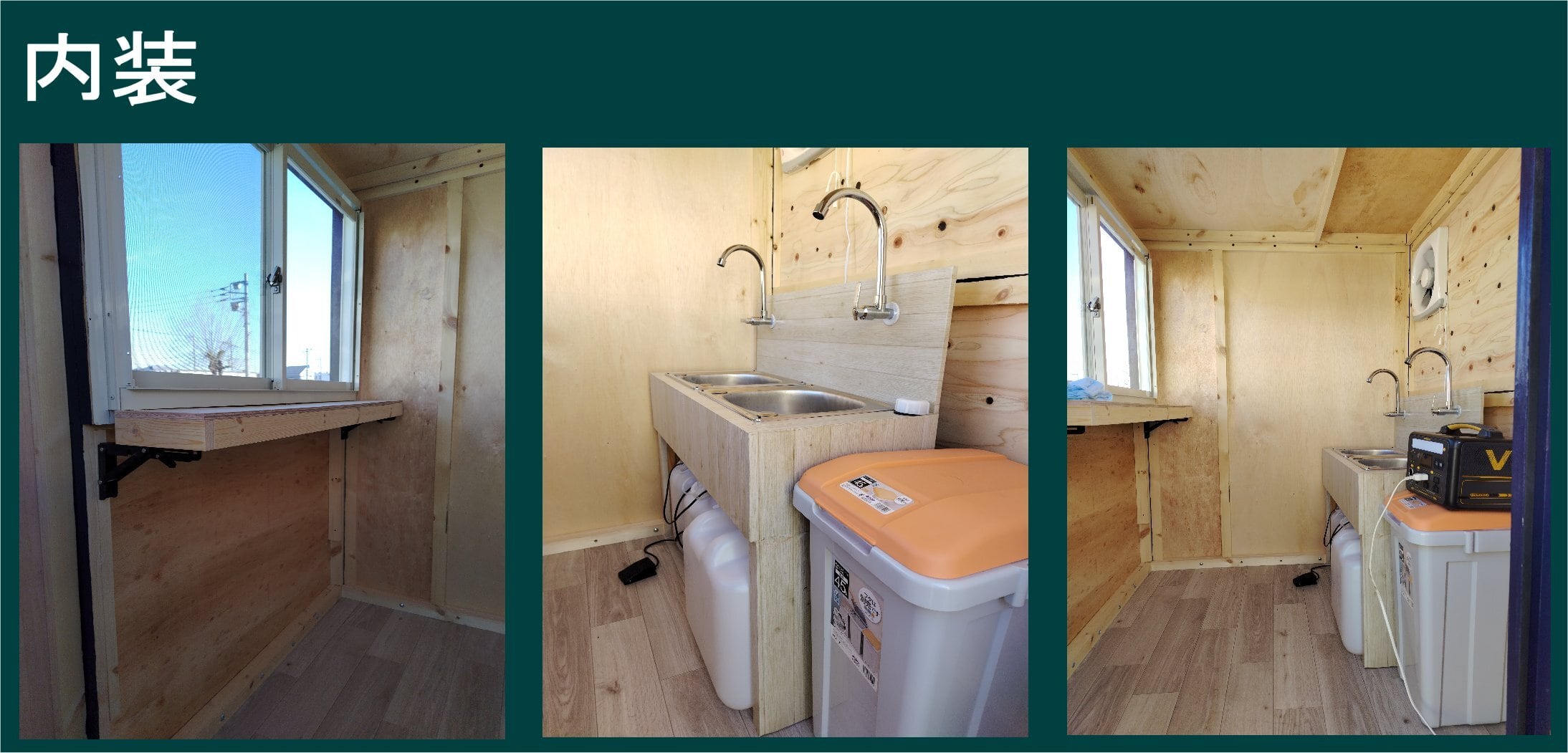 付属品 2層式シンク(電動ポンプ、足ふみスイッチ)、20リットルタンクx4、換気扇、室内用カウンター、室外用カウンター、サッシ、網戸